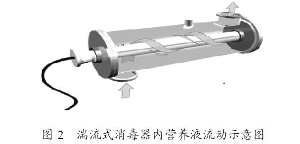 針對上述問題,自行設(shè)計了一種新型的紫外線消毒器[17]:在消毒腔體內(nèi)安裝螺旋形導(dǎo)流片,使?fàn)I養(yǎng)液以湍流形式流動(圖2),即讓沿不銹鋼腔體內(nèi)壁流動的營養(yǎng)液也有一部分時間是在石英套管附近流動。營養(yǎng)液在距離紫外燈管較近或較遠的兩個區(qū)域停留的時間接近,從而解決了因一部分營養(yǎng)液滅菌不徹底而影響整體滅菌效果的問題。