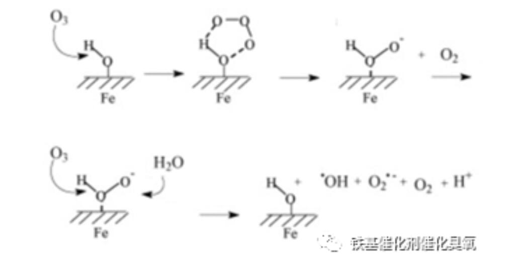 這張圖,是我根據(jù)該論文改繪的(見文獻(xiàn):Tao Zhang, Jun Ma∗. Catalytic ozonation of trace nitrobenzene in waterwith synthetic goethite. Journal ofMolecular Catalysis A: Chemical 279 (2008), 82–89),原理未動(dòng),主要是為配合上述化學(xué)反應(yīng)式,稍做改動(dòng)。由此我認(rèn)為:不論是臭氧在液相、還是在催化劑表面,形成自由基反應(yīng)步驟是一樣的。