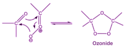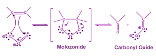 步驟1: 臭氧向碳-碳鍵的親電子加成形成了非常不穩定的莫洛宗尼德中間體。 由于這種不穩定的性質,莫洛宗尼德繼續反應-分解形成羰基分子和羰基氧化物分子,如下所示: