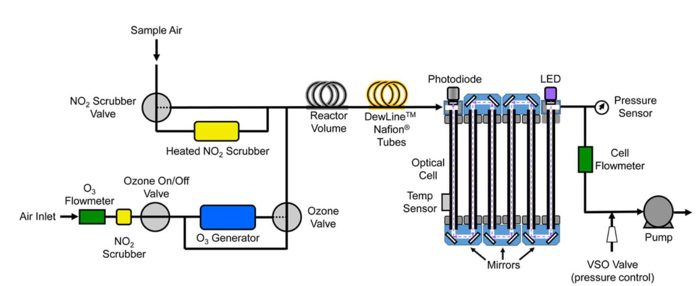 下圖是 美國(guó)2B 405 nm NO x 型監(jiān)視器的簡(jiǎn)化示意圖。樣品空氣由氣泵以~1.5 L/min的流速連續(xù)吸入儀器。洗滌器閥交替旁路并通過(guò) NO 2 洗滌器發(fā)送樣品空氣以去除樣品中的所有 NO 2,從而允許在沒(méi)有 NO 2 的 (I o) 和存在 (I) 的 NO2 的情況下測(cè)量光強(qiáng)度。然后使用比爾-朗伯定律計(jì)算 I和 Io 的 NO 2 濃度。