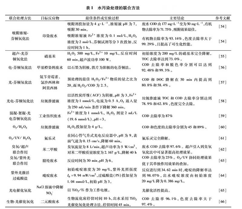 高級氧化技術(AOPs)高效、使用范圍廣、處理效果優異,但其基礎理論還不十分完善,且實際污染系統復雜多樣,存在處理成本高、反應條件苛刻、反應器復雜等問題。將高級氧化技術復合使用或與其他技術相結合,可發揮其協同作用,強化污染物處理效果。