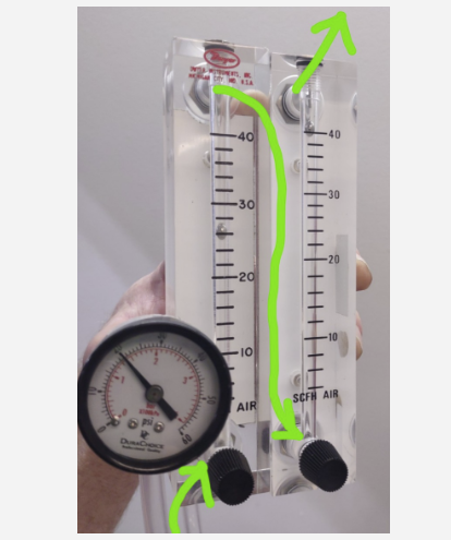 當(dāng)氣體,無(wú)論是空氣還是氧氣,通過(guò)流量計(jì)加壓時(shí),流量計(jì)將讀取不準(zhǔn)確的流量。下圖顯示了兩個(gè)相同的流量計(jì)并排,從氧氣濃縮器流過(guò)每個(gè)流量計(jì)的氧氣量相同。左邊的流量計(jì)壓力為20 psi,右邊的流量計(jì)壓力為0 psi。盡管流經(jīng)流量計(jì)的氧氣量是相同的,但流量讀數(shù)是不同的。在壓力下,流量計(jì)的讀數(shù)將低于實(shí)際流量。