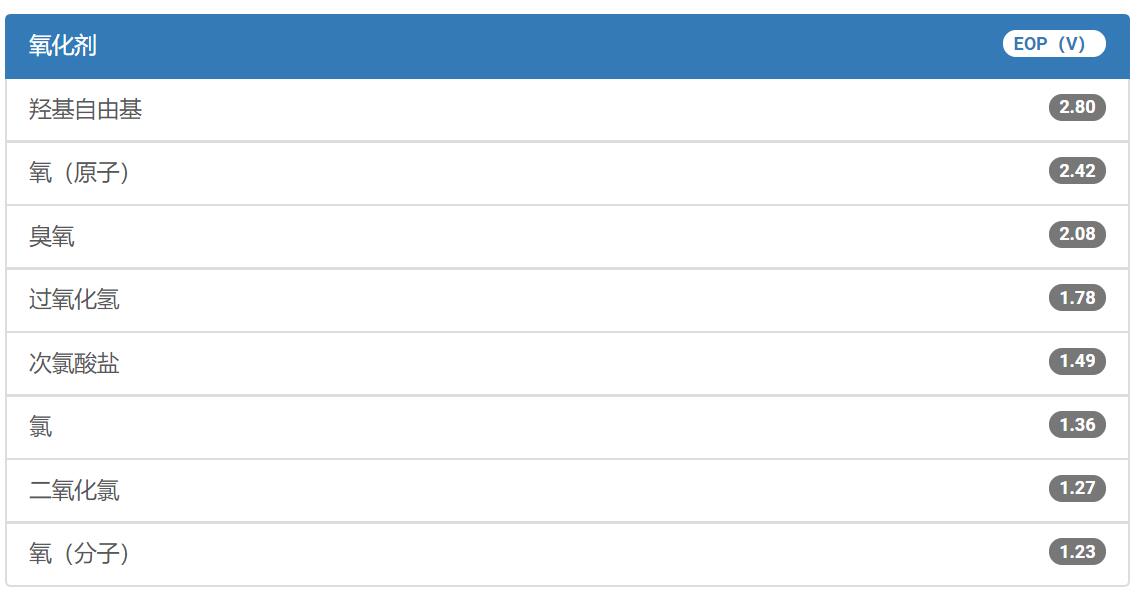 高級(jí)氧化工藝(AOP)結(jié)合了臭氧(O3)、紫外線(UV)、過(guò)氧化氫(H2O2))或催化劑提供強(qiáng)力水處理溶液,用于通過(guò)COD、BOD或TOC測(cè)量的殘余有機(jī)化合物的還原(去除)。所有AOP都設(shè)計(jì)用于產(chǎn)生羥基自由基,正是羥基自由基高效地破壞有機(jī)化合物。下圖顯示了羥基自由基與其他氧化劑的氧化能力。