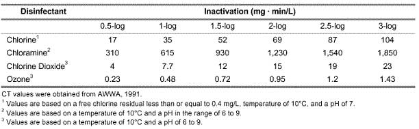 原生動(dòng)物隱孢子蟲(chóng)很難被氯和氯胺滅活。對(duì)于1-log失活(= 90%失活),氯失活的Ct值在3000和4000mg min / L之間變化。兩個(gè)表都來(lái)自環(huán)境保護(hù)局(EPA)。