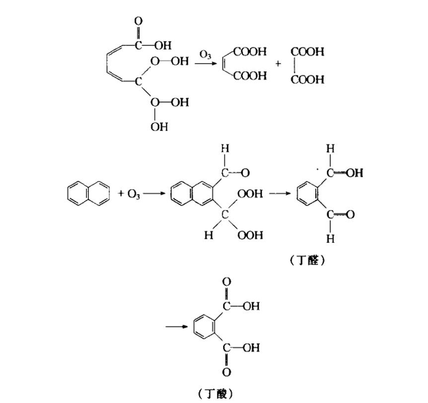 (2)臭氧和芳香族化合物的反應臭氧和芳香族化合物的反應較慢,在系列苯<萘<菲<嵌二萘<蒽中,其反應速度常數逐漸增大。其反應如下